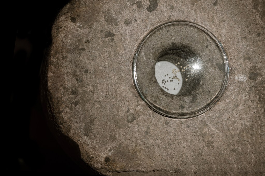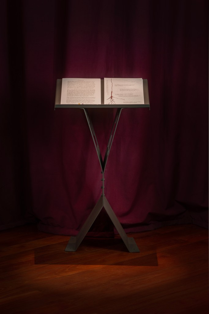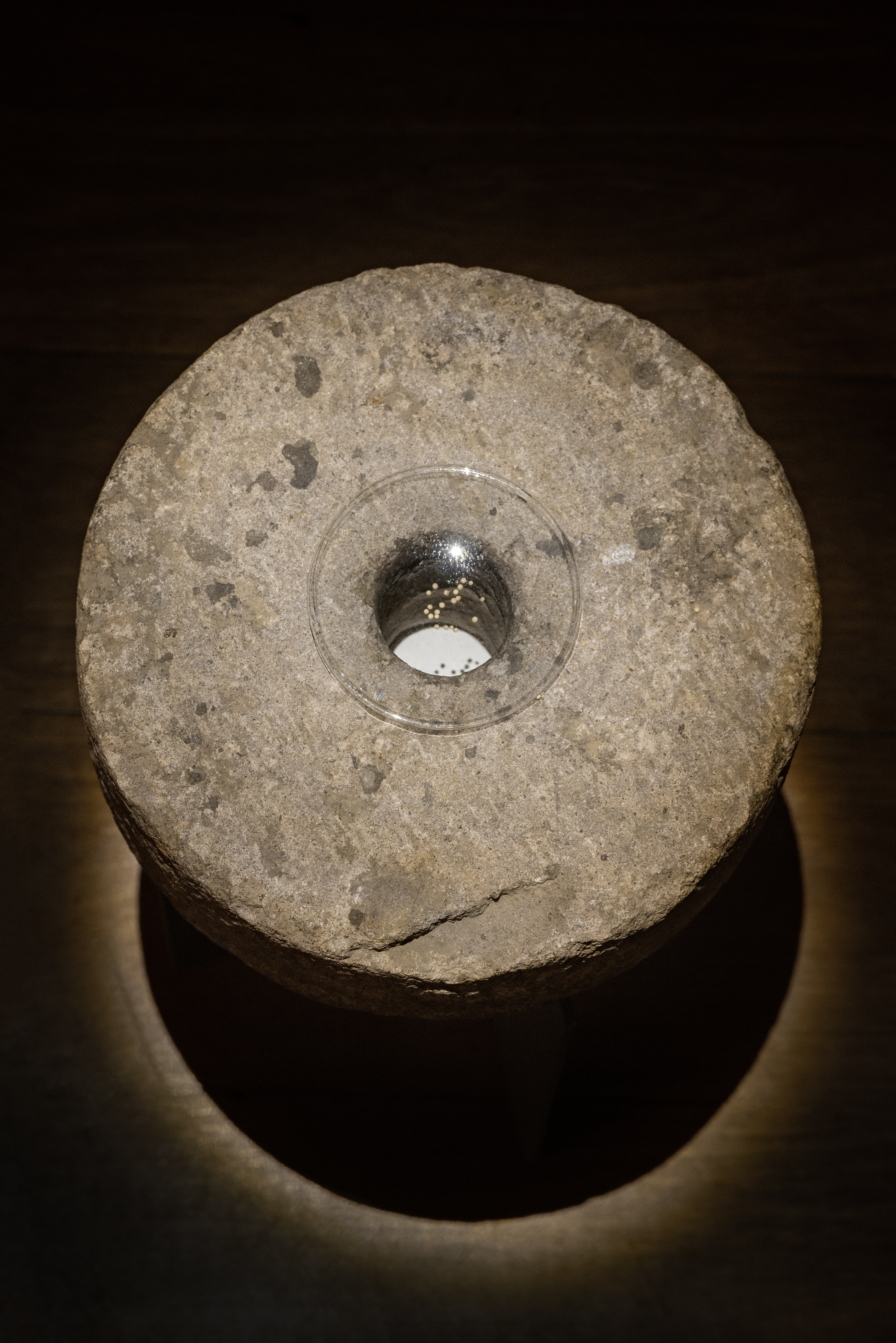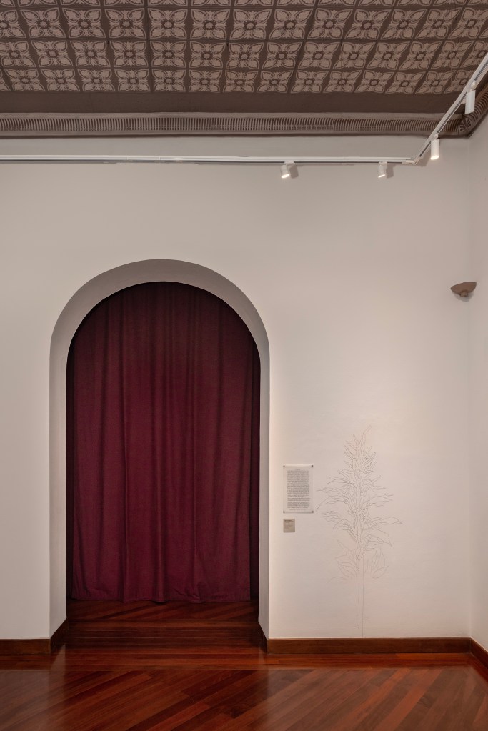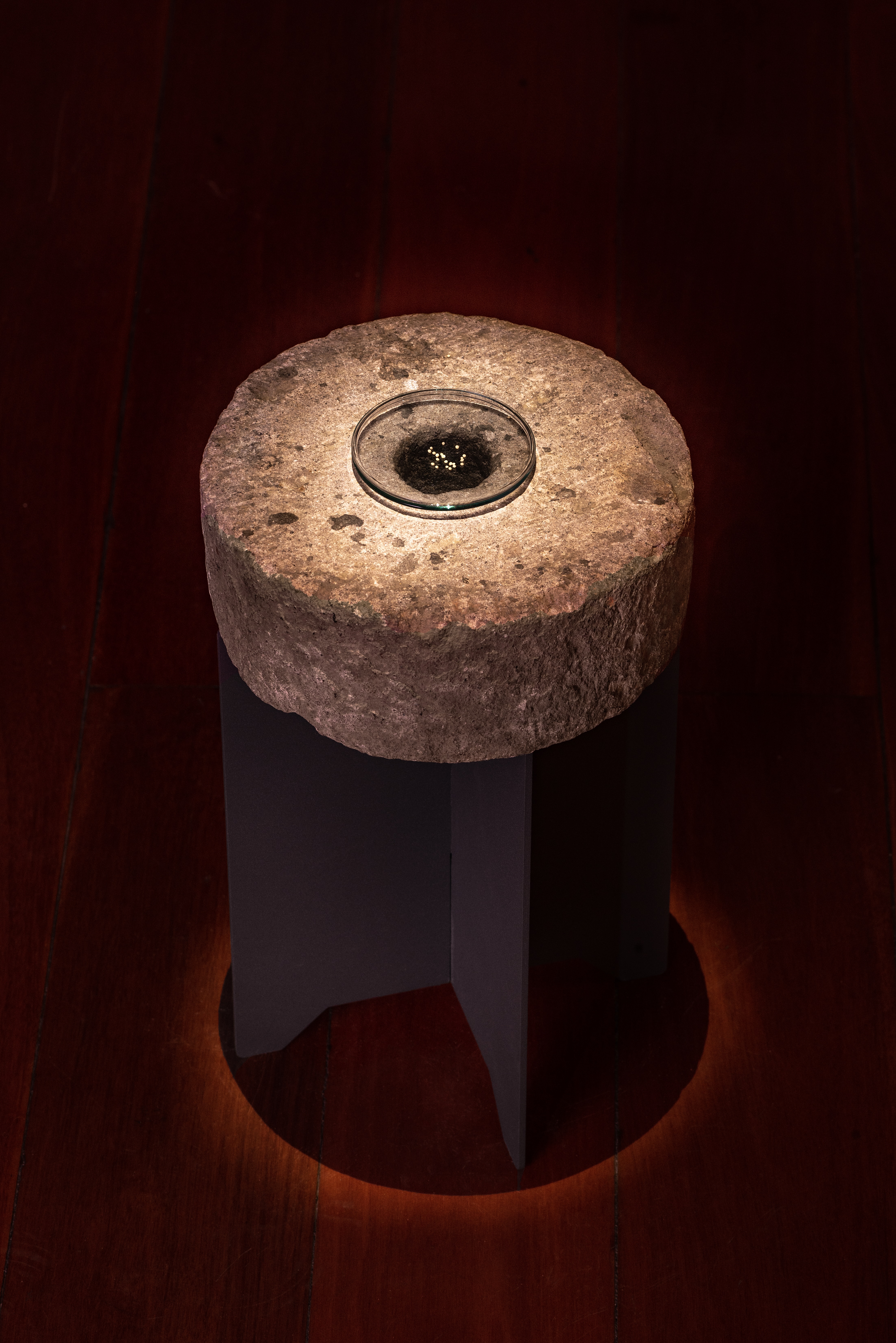 Esta es una estancia y a la vez es un templo que acoge, honra y sostiene una semilla de amaranto. Esta semilla que lleva dentro de sí, en su mínimo cuerpo, el potencial del universo. Un templo es un santuario separado del mundo cotidiano, es la vivienda de una entidad sagrada; un puente entre el cielo, la tierra y el mundo de abajo; es una vía de comunicación entre la luz que llega de la atmósfera, la superficie en la que habitamos y la oscuridad del subsuelo. En esta estancia/templo ponemos nuestra atención en lo más mínimo: una semilla, una entidad pequeñísima que requiere de nuestros cuidados amorosos para germinar.