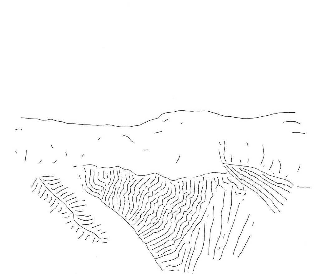 Between 2019 and 2023, I have been working at a small studio in Quito, Ecuador and the studio window faces the mountain Auqui. The window is located in a key position, so it opens up the view of the mountain, the houses, the plantings on the slope, the irregularities of the land, and the sky. After working at this place for several months, I realized that the window was the element that attracted me the most about the room: the possibility of opening up the gaze in that manner. The experience of being at this specific place and looking at Auqui through the window has informed a series of drawings and paintings that explore my relationship with the landscape as these irregular lines become my primal territory and infuse my way of mark-making. This visual work registers the experience of dwelling in a city in the middle of the Andes surrounded by ravines, and the ways in which the more-than-human entities (such as mountains, plants, or weather) inform a way of seeing, and a way of drawing.